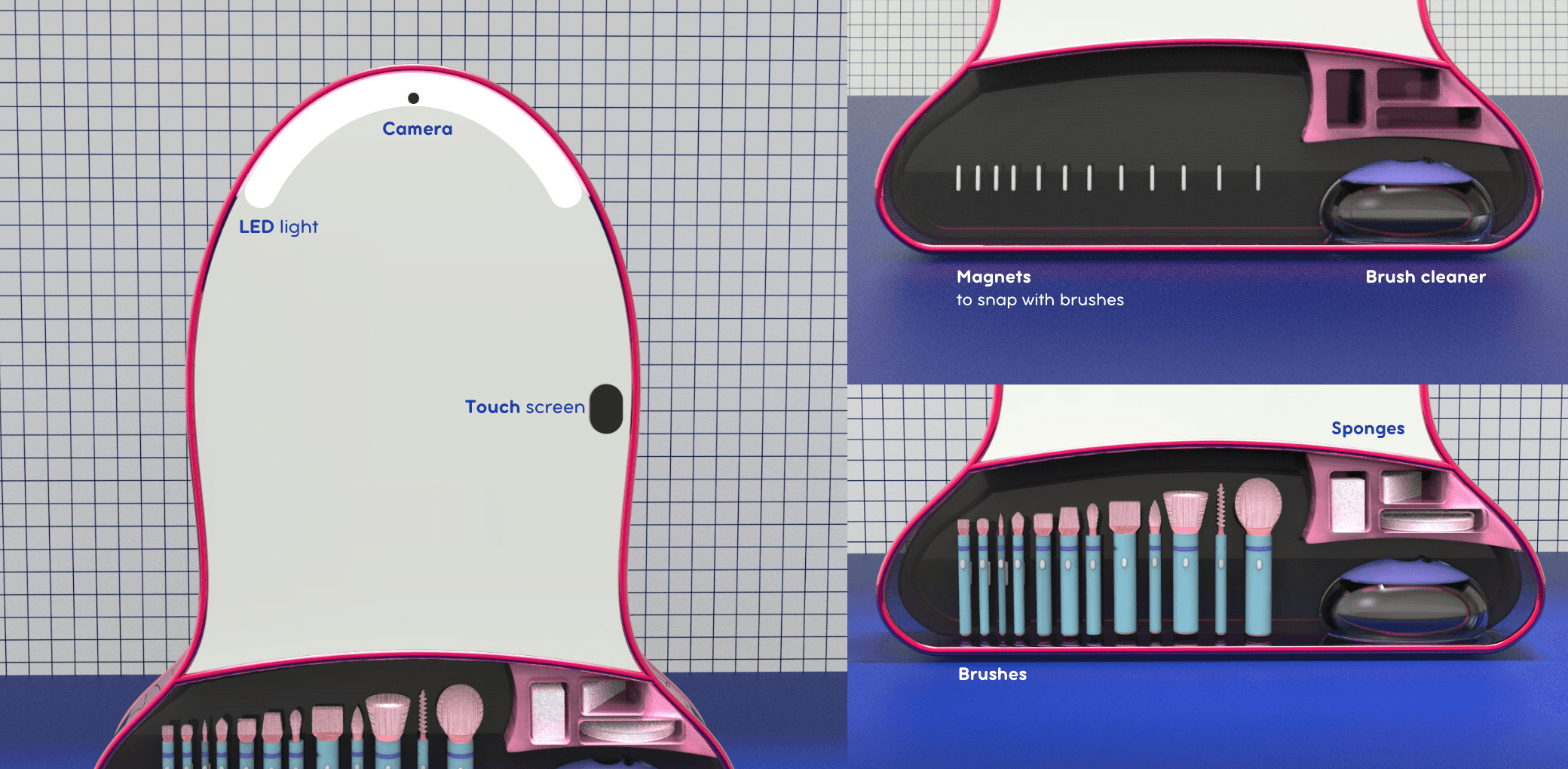 Each brush tool is secured with magnetic attachments, both on the mirror and brushes, while custom slots keep sponges and the integrated cleaner neatly organized. The rotating brush cleaner cleans brushes in 30 seconds, reducing clutter and saving time during quick touch-ups. The LED lighting ensures accurate color application, while the built-in camera projects the tutorial directly onto the user’s face on the screen, providing real-time guidance.