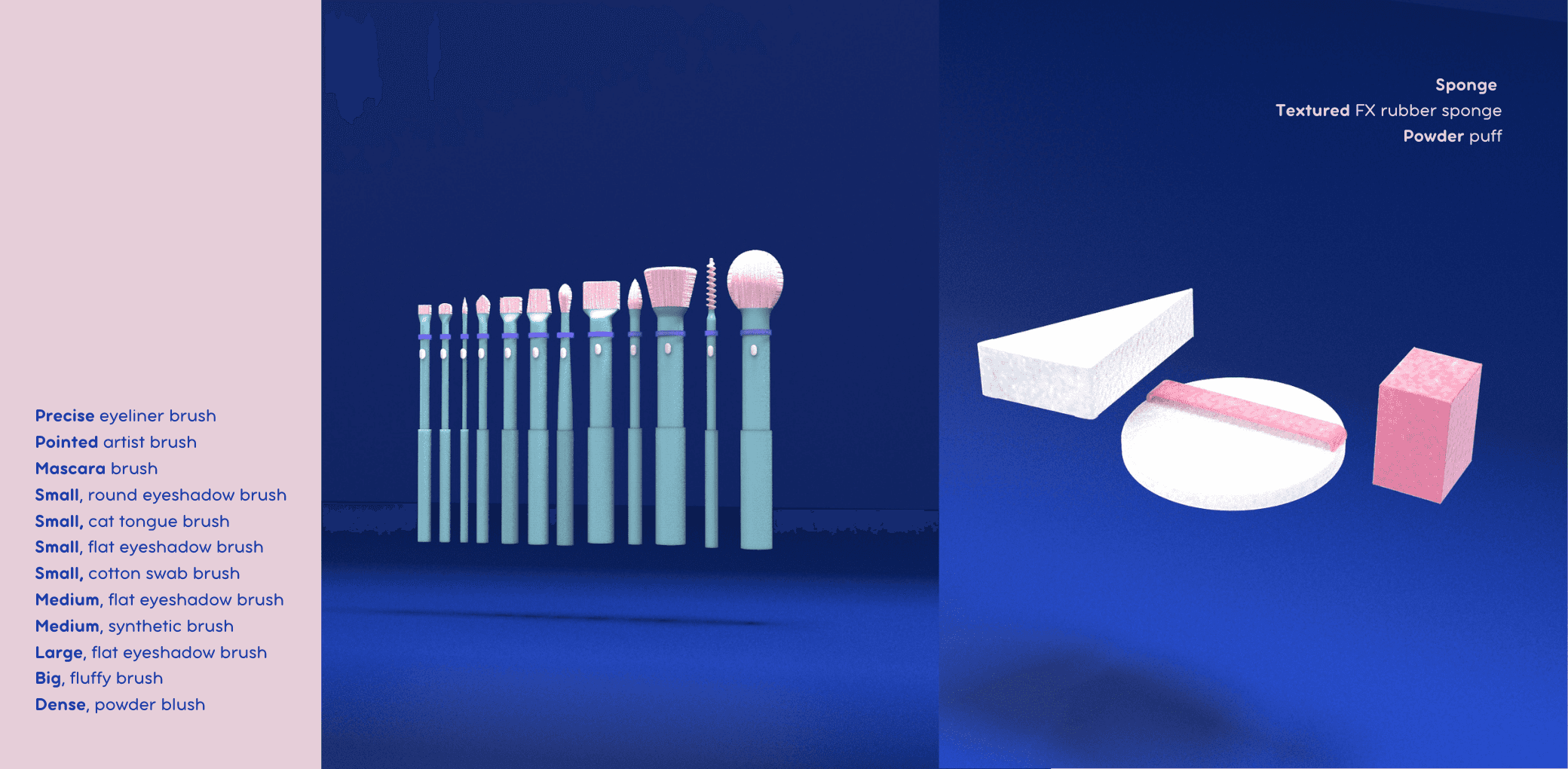 The brushes and sponges were designed based on extensive research into the actual tools used by Cirque du Soleil performers. To fit seamlessly into the kit, they are collapsible and compact. Each tool is assigned a unique identification number, graphically marked on the brushes to prevent confusion. These numbers are also referenced in the tutorials, ensuring an organized and intuitive application process.