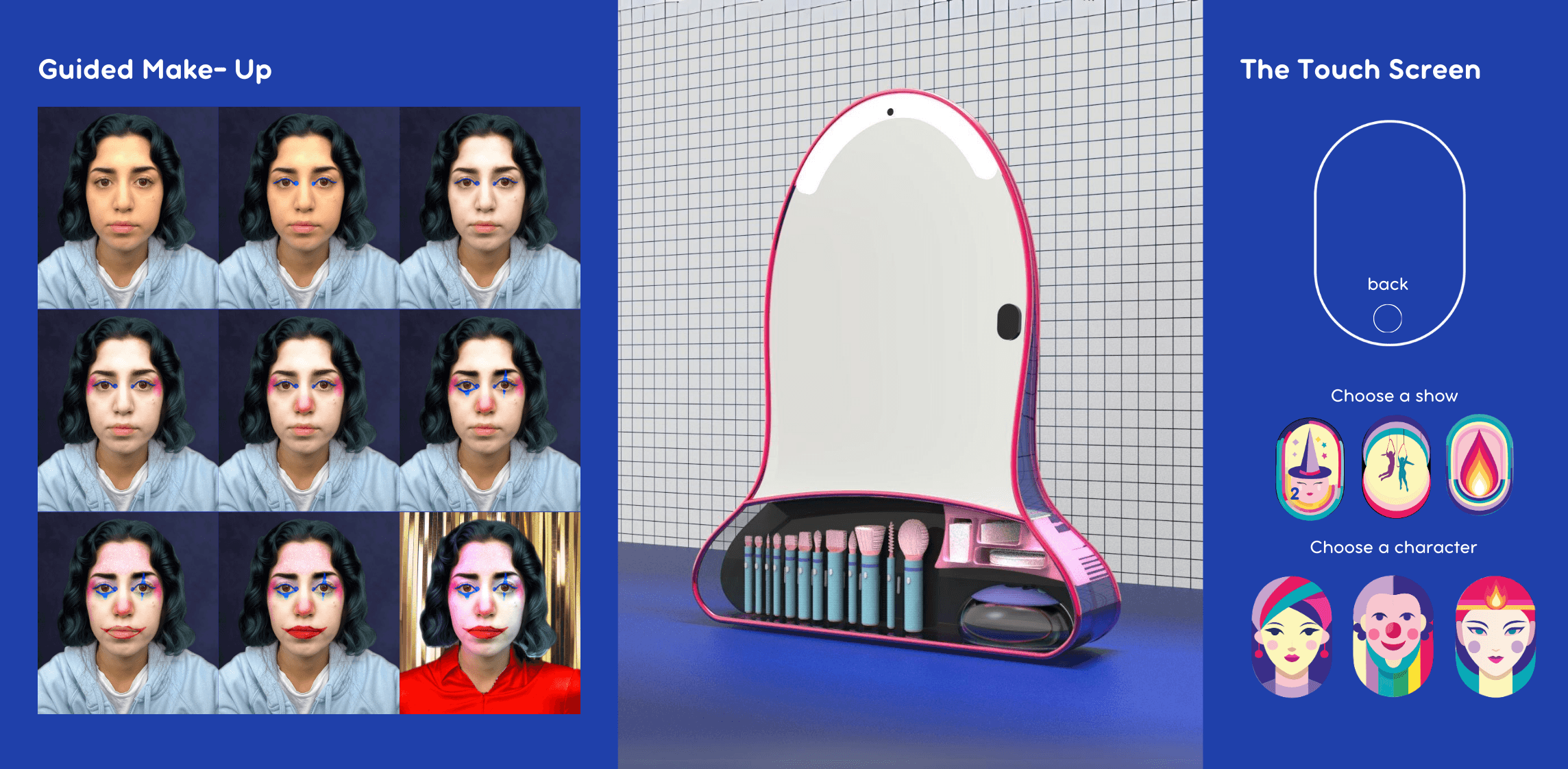The touchscreen interface is connected to a dynamic database of active shows, providing users with up-to-date character makeup options. Once the user selects the desired character, the real-time tutorial system utilizes data-driven content to display the necessary tools and application steps directly on the screen. This interactive guidance ensures precision and consistency in makeup application.
