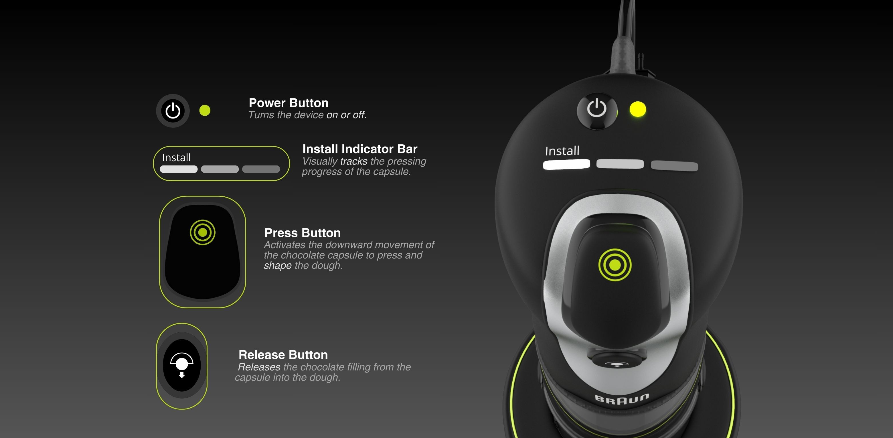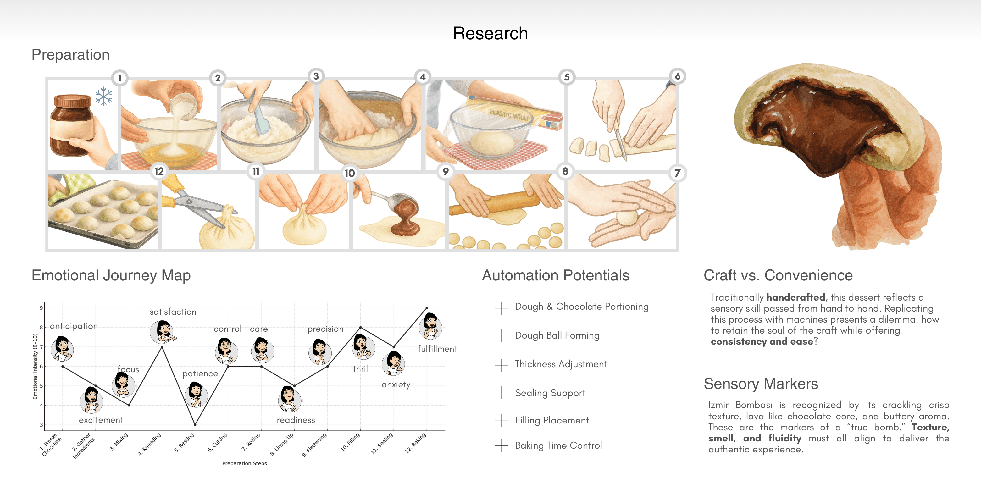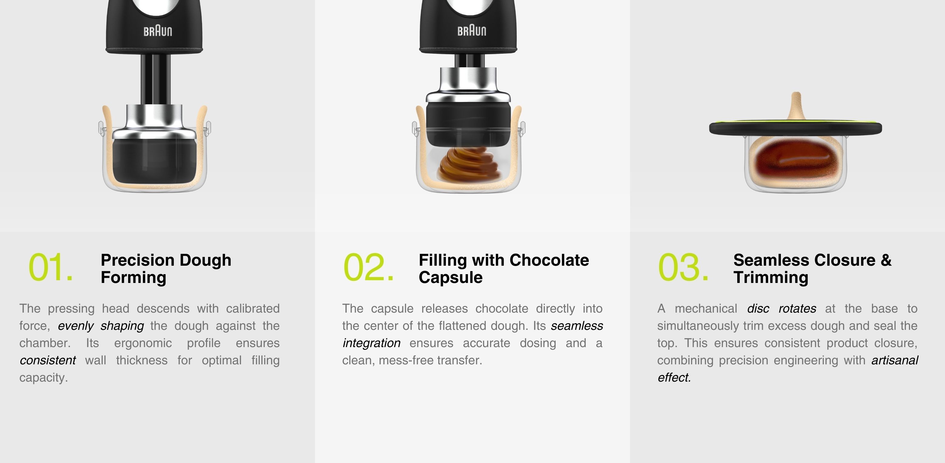 Created in collaboration with De’Longhi Braun Household GmbH, this project explores how a cultural dessert ritual can be transformed into a playful product experience. İzmir Bombası is a molten-filled chocolate pastry popular in Turkey, known for its soft dough and warm, oozing center. This compact kitchen device allows users to make İzmir Bombası at home, turning a handcrafted recipe into an emotional, sensory interaction.
