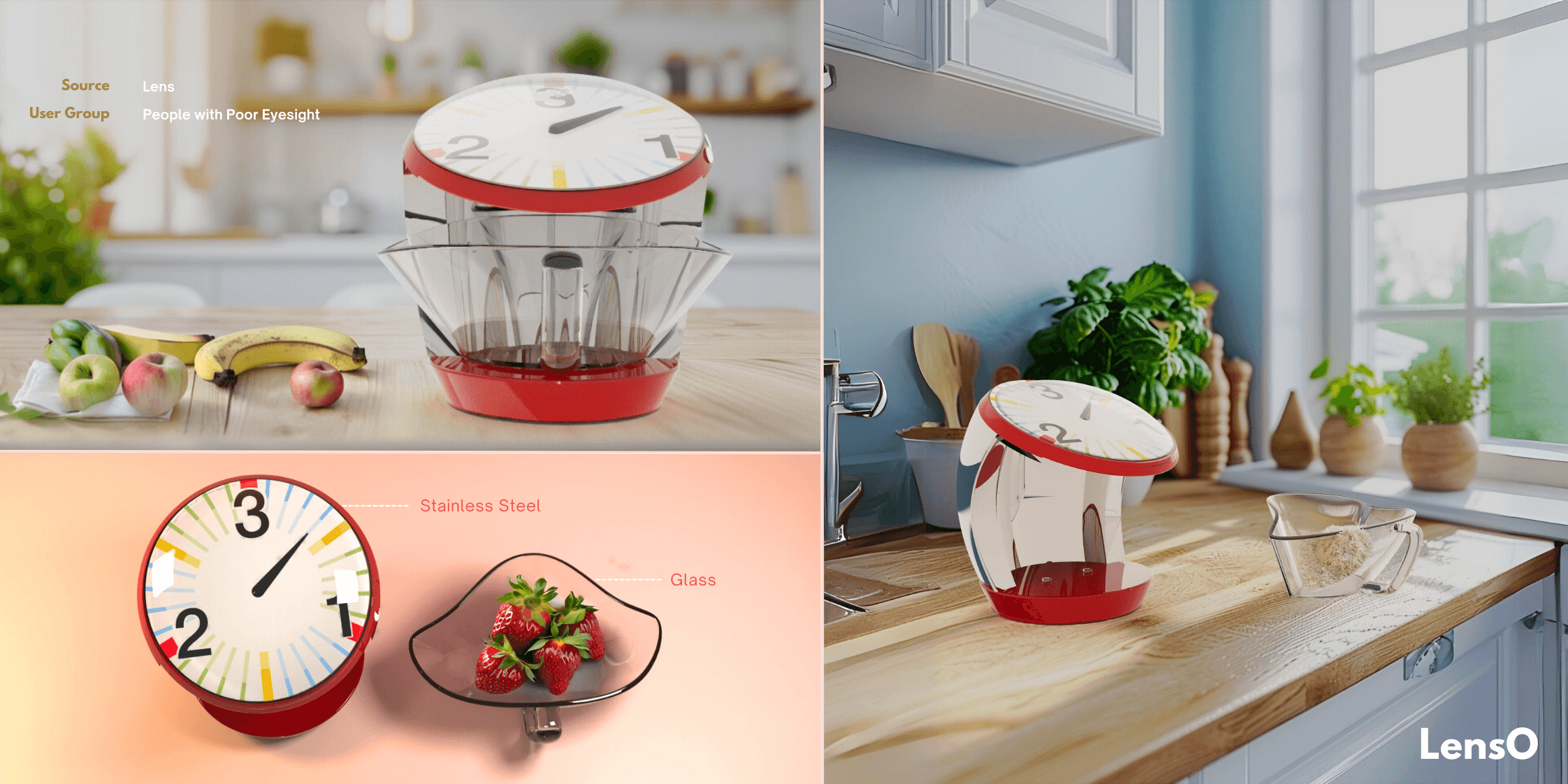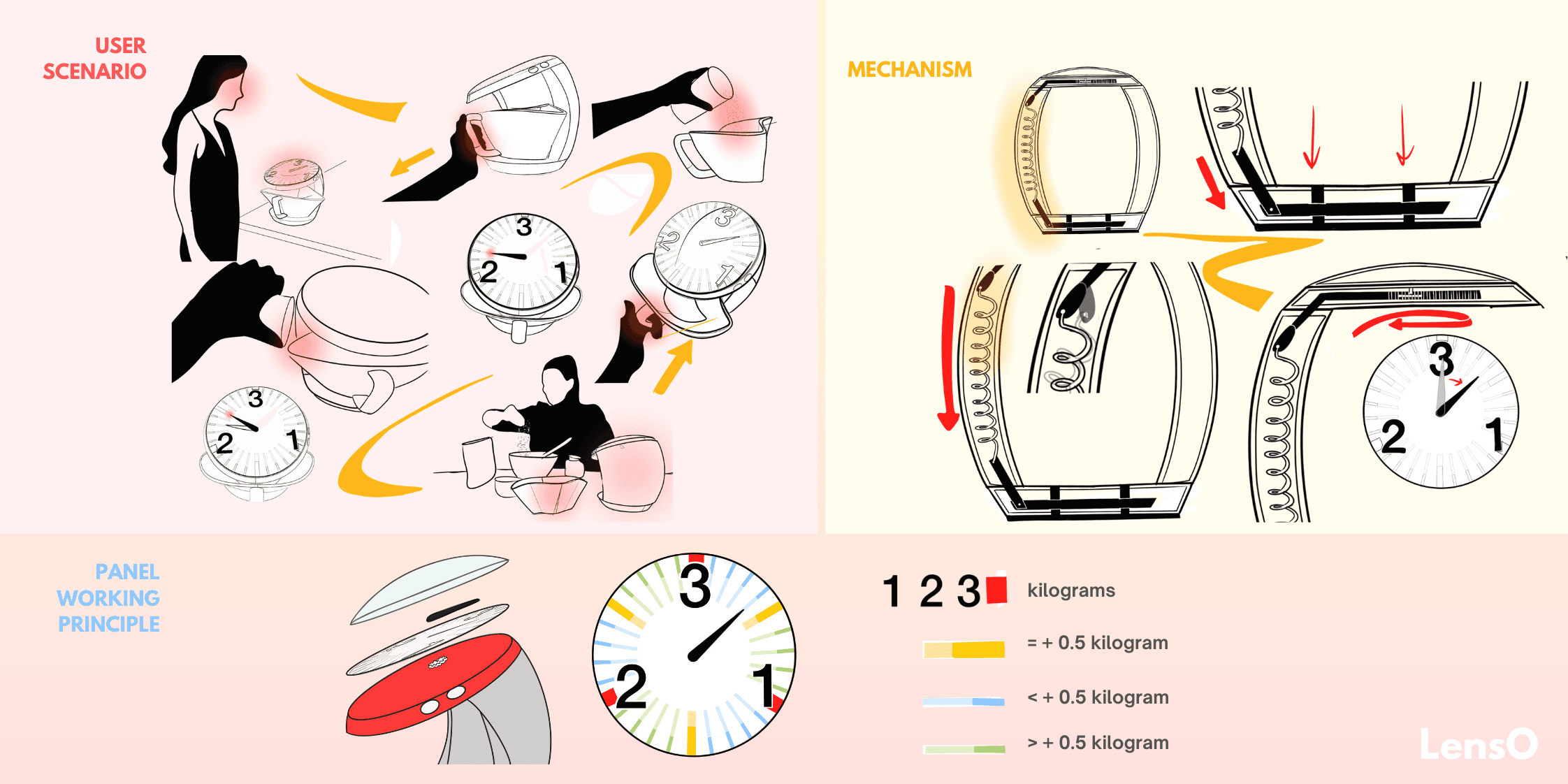 LensO is a mechanical kitchen scale designed with the metaphor “a kitchen scale is a lens.” Targeting users with poor eyesight, the product establishes a strong connection with its user group through this metaphor.