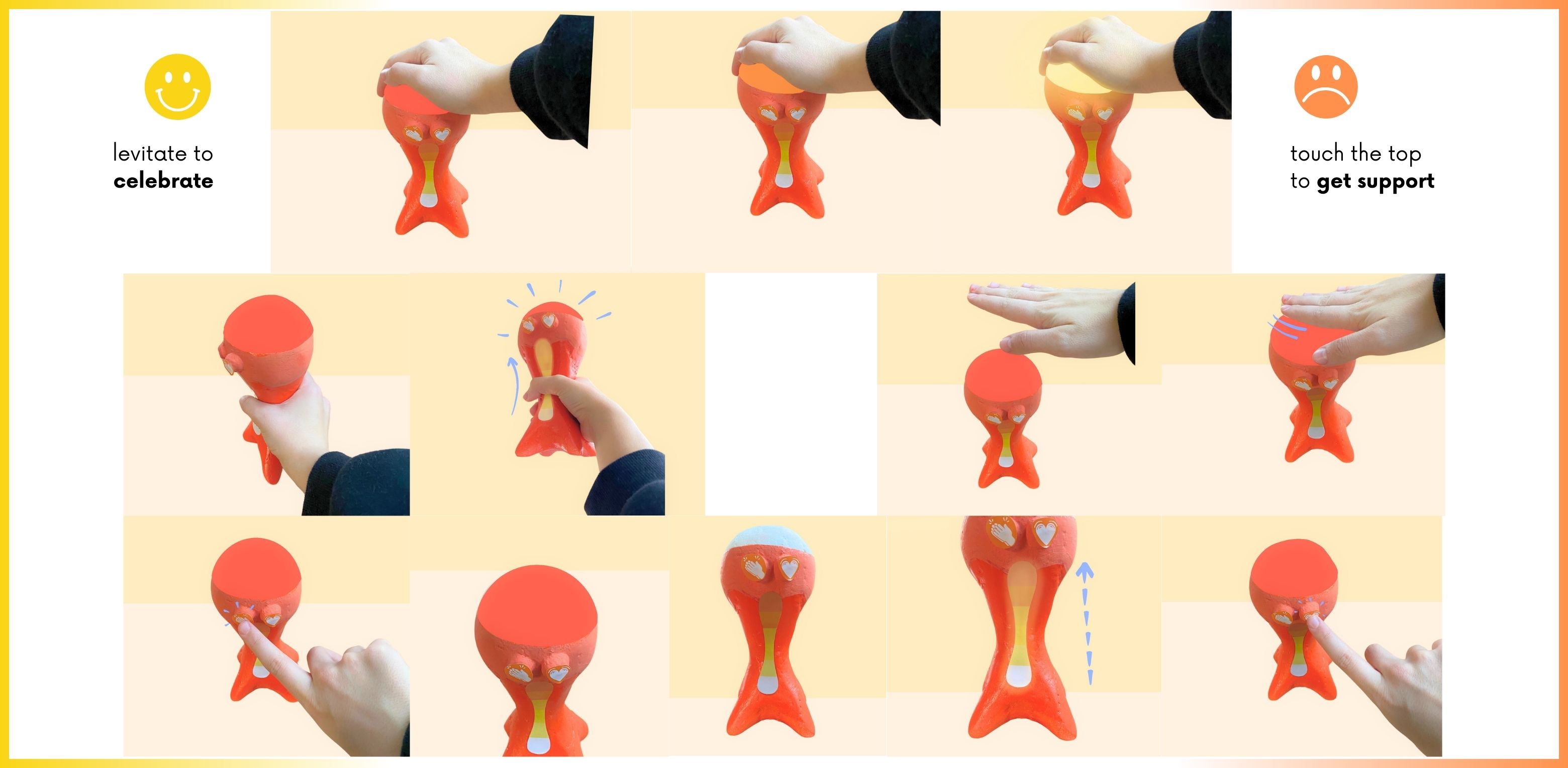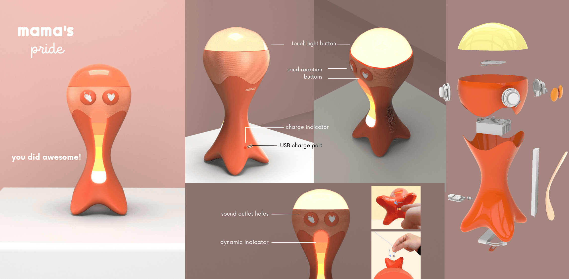 Introducing Mama’s Pride, a self-care companion that celebrates the power of reflection. Designed for individuals with body dysmorphic disorder (BDD), it becomes part of the user’s emotional journey. After returning home, the interaction is simple yet profound: on good days, the object is held up—a personal symbol of pride. On bad days, a gentle touch activates sensor-based feedback, sparking dynamic light and sound responses. Like a social trophy, Mama’s Pride creates a moment of connection, offering comfort and solidarity, even across distances.