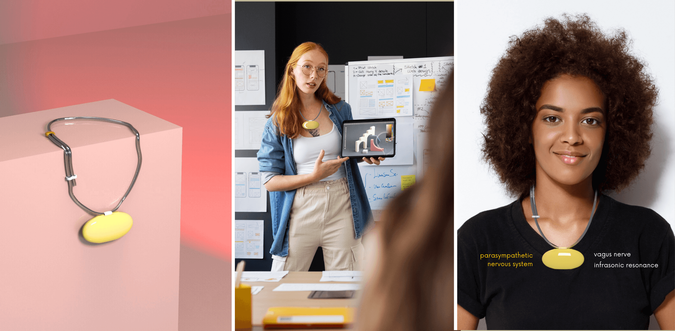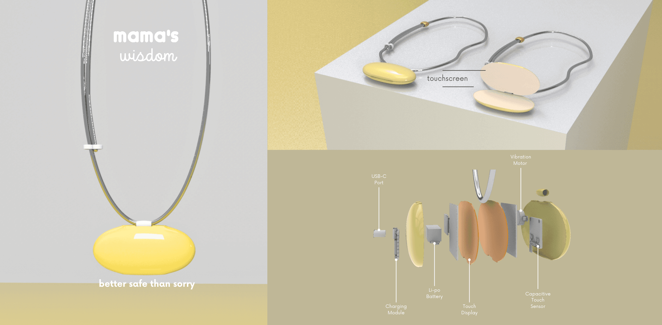 Introducing Mama’s Wisdom, a calming companion designed to support individuals during moments of stress and self-doubt. The product offers two distinct scenarios: one focused on relaxation, the other on gentle distraction through knowledge. Before stressful events, it soothes the user with infrasonic resonances, promoting calm and confidence. In tense environments, it shifts attention through body-positive affirmations and interactive animations, helping to ease the mind.