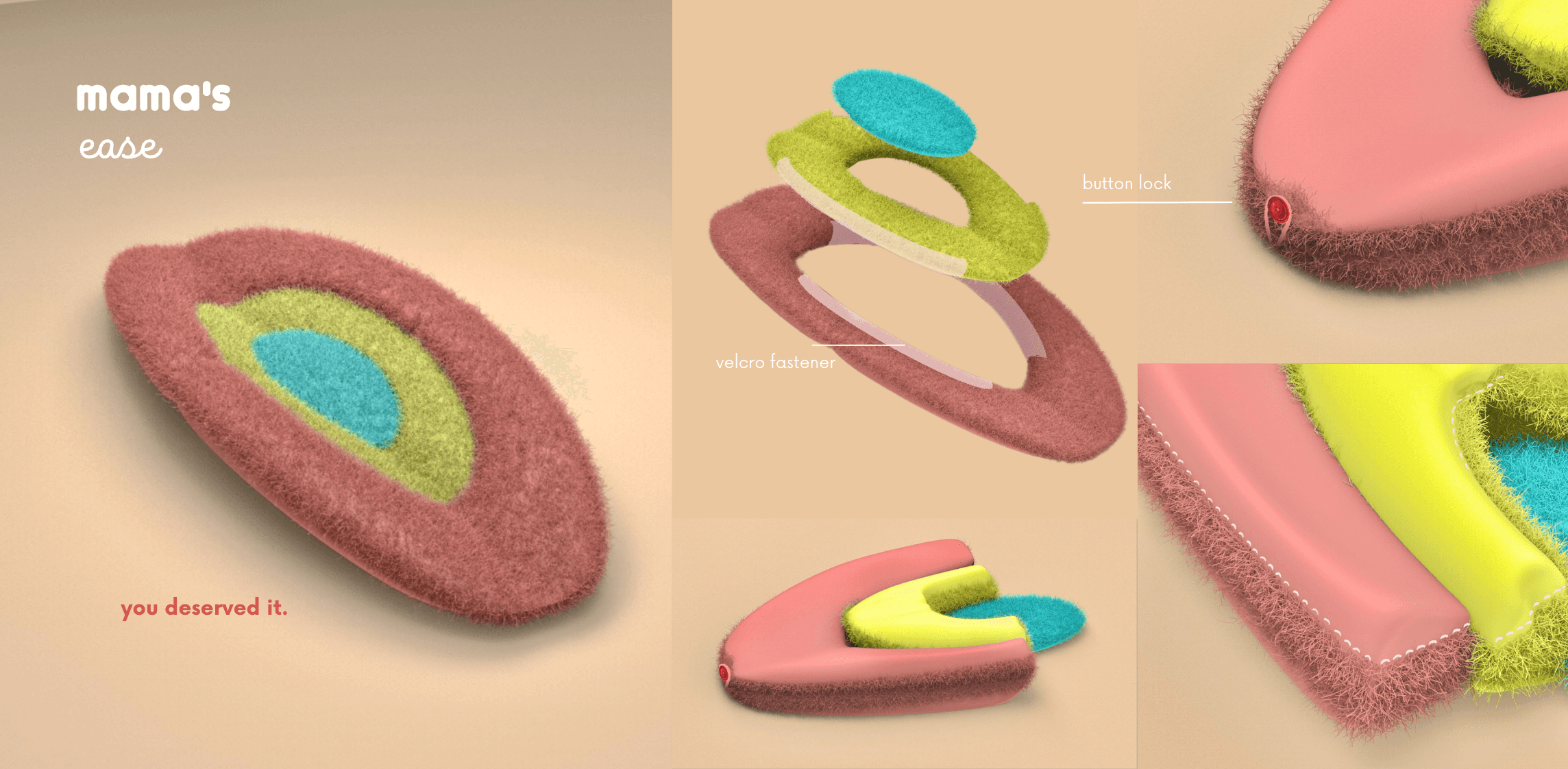 Introducing Mama’s Ease, a comforting product that embodies the nurturing and soothing qualities of a mother. Designed for relaxation after a long day, its interlocking modular system allows users to adapt the product for various purposes. The angled structure responds to the user’s weight, creating a gentle rocking motion reminiscent of a cradle. Foldable and portable, this comfort module brings relaxation and warmth wherever it’s needed.
